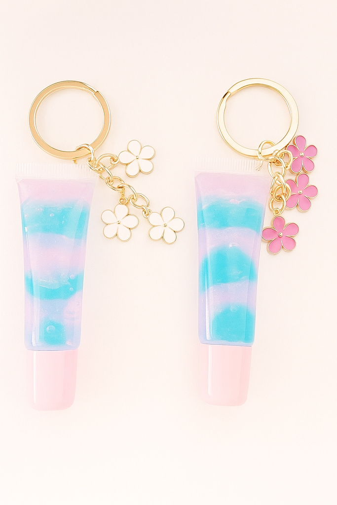 Cotton Candy scented swirl lip glosses with multi colored flower keychains. Goes on lips clear. Perfect for on the go.